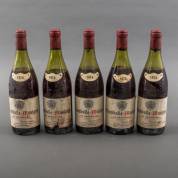 Vijf flessen rode wijn: Servelle-Tachot, Chambolle-Musigny 'Les Amoureuses', 1974 -vulniveau's: tussen de 6 en 4,5 cm, gaatje bovenin elke capsule-