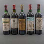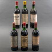 Zes diverse flessen rode wijn, alle Pauillac: Château Lynch-Bages, 1966 -vulniveau: mid shoulder-; Château Pichon Longueville Comtesse de Lalande, 1971 -high shoulder-; Château Pontet-Canet, 1974 -base neck-; Château Pichon Baron (de Pichon-Longueville), 1975 -base neck-; Château Pedesclaux, 1980 -high shoulder-; en Château Lynch-Moussas, 1981 -base neck-