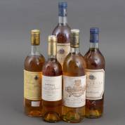 Vijf diverse flessen dessertwijn: Château Laurette, Sainte-Croix-du-Mont, 1973; Château Coutet, Barsac, 1985; tweemaal Barton & Guestier, Sauternes, 1989; en halve liter Château Doisy Dubroca, Barsac, 1994 -vulniveau's: Laurette high shoulder en capsule licht beschadigd, de rest base neck-