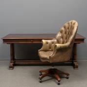 Notenhouten schrijfbureau met drie lades staand op twee renaissance-stijl kolompoten, daarbij: gecapitonneerde groen lederen bureaustoel, 20e eeuw, bureau circa 78 × 190 × 84,5 cm