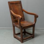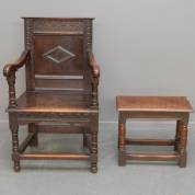 Eikenhouten armstoel met gestoken decor, Engeland, vermoedelijk 17e eeuw, 102 × 61 × 55 cm, daarbij: eiken bedsteekrukje met gedraaide poten