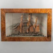 Diorama met scheepsportret van een geheel Nederlands fregat met bemanning, circa 1820-1830, met mahonie omlijsting, 44 × 67 × 16,5 cm