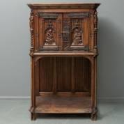 Eiken tweedeurs credenskastje met neogotische motieven en open onderstel, 19e eeuw, 150 × 94 × 47 cm