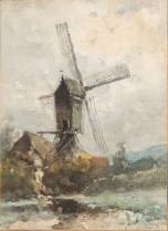 Hollandse School: gezicht op een molen, aquarel, r.o. onduidelijk gesigneerd, verso toegeschreven aan P.J.C. Gabriël, maar vermoedelijk niet van zijn hand, 24,5 × 18 cm