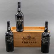 Drie flessen vintage port: Fonseca 1985, in aangebroken houten kist -flessen te donker om vulniveau te zien, afdichting lijkt in uitstekende staat-