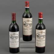 Drie flessen rode wijn: Château Giscours, Margaux, 1969 -vulniveau: high shoulder, één etiket gehavend-