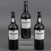 Drie flessen vintage port: Osborne 1995 -vulniveau: alle base neck, één met weggescheurd selo-
