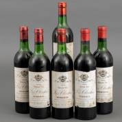 Zes flessen rode wijn: Mähler-Besse 'Les Cloches', Pomerol, 1974, 1975 en 1976 -vulniveau: alle high shoulder-