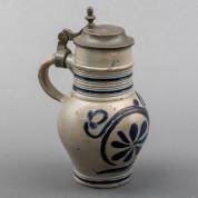 Grijze steengoed kan, met blauw geabstraheerd bloemdecor, het deksel met inscriptie WZ, Westerwald, 18e eeuw -haarlijn bij de rand, chips langs de rand-, 21 cm