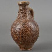 Donkerbruin-grijze steengoed baardmankruik, Frechen, tweede helft 17e eeuw -oor en bovenste deel van hals gerestaureerd-, 19,5 × Ø 11,5 cm