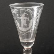 Wijnglas met 'Henske in de Kelder'-decor, afgebeeld als man met kelk tussen de fusten, 18e eeuw -kelkaanzet mogelijk gerestaureerd-, 14,5 × Ø 6,6 cm