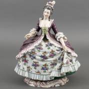 Porseleinen beeld: jongedame in bloemenjurk, uitvoering Dressel, Kister & Co, Passau, circa 1900 -defect aan rechterhand en bloem, en aan hoed, barst in jurk-, 38 × 31 × 20 cm