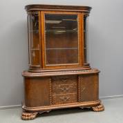 Notenhouten vitrinekast met rechte kap en gebogen ruitjes, laatjes en deurtjes in de uitspringende onderkast, staand op klauwpoten, barok-stijl, Duitsland, begin 20e eeuw, blad gekrast, kleine defecten-, 172 × 137 × 48 cm