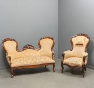 Mahonie vlinderbank met velours bekleding, 147 cm breed, daarbij: mahonie voltaire, 70 cm breed, beide tweede helft 19e eeuw
