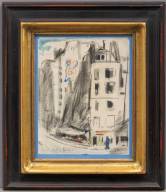 Tekening: zicht op een straatje, gemengde techniek op papier, l.o. onduidelijk gesigneerd en gedateerd '16 -missende hoekjes bovenzijde, scheurtje en gaatje linksonder-, 27 × 21 cm