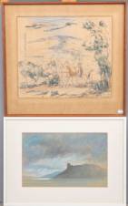 Gab Smulders (1931-2014), 'Schotland', aquarel, r.o. gesigneerd, daarbij: koets op landweg, tekening, r.o. gesigneerd 'W de Zwart', maar vermoedelijk niet van de hand van Willem de Zwart, begin 20e eeuw, tekening koets 28 × 33 cm