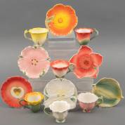 Zes porseleinen kop-en-schotels in bloemvormen, modern, Ø 15 cm