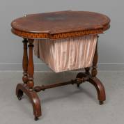 Bijzettafeltje met wortelnotengefineerd blad en daaromheen een ingelegde meanderrand, daaronder een kluwenlade -gebruikssporen, afwerking met diverse vlekken, speling in verbindingen-, 66 × 76 × 49 cm