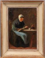 Schilderij: lezende vrouw aan tafel, olieverf op doek, niet gesigneerd, 34,5 × 23,5 cm