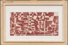 Mogelijk Antoinette Gispen (1922-2015), compositie met rood, houtsnede op vloeipapier, l.o. resten van signatuur, 37 × 18 cm