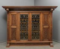 Vierdeurs eiken kast, de middelste twee deuren met glas-in-lood, de buitenste twee deuren met snijwerk, de kap met twee leeuwenkoppen en het basement met twee bolklauwpoten, tweede helft 20e eeuw, 190 × 258 × 54 cm -opbrengst ten bate van het Rijksmuseum Amsterdam-