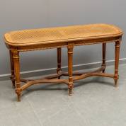 Eiken bankje met rotan zitting en gecanneleerde pootjes verbonden door kruisregel, 20e eeuw -lichte gebruikssporen-, 50 × 100 × 38 cm