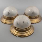 Drie plafonnières met gesatineerde en geslepen glazen kap in messing montuur met palmetrand -één montuur met deukje in rand-, 23 × Ø 37 cm