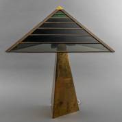 Drielichts messing piramidevormige tafellamp, de kap gezet met groen glas, art deco -één glasplaatje gechipt-, 68 × 59 × 48 cm