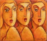 John Noy (1951), drie vrouwen in geel en oranje, olieverf op doek, r.o. gesigneerd en gedateerd '01, 40 × 35 cm