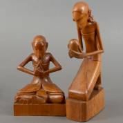 Twee diverse gesneden houten boekensteunen: vrouw met offer, en biddende man, Bali, tweede helft 20e eeuw -het grootste beeld met restauratie aan de armen-, grootste hoogte 32 cm