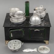 Blikken poppenfornuis met diverse toebehoren -enkele pannetjes verbogen-, 23 × 30 × 20 cm