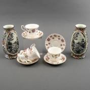 Paar keramische vazen met decor: herder in landschap, model Berger, uitvoering Société Ceramique, Maastricht, daarbij vier kop-en-schotels, diverse decors, uitvoering Royal Albert, Engeland, 21 × 13 × 11 cm