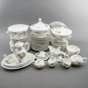 Porseleinen serviesgedeelte Rosenthal gedecoreerd met polychroom bloemdecor, bestaande uit: 23 dinerborden, 26 ontbijtborden, tien soepborden, ovale schaal, ronde schaal, twee kleine ovale schalen, drie vleeswarenschaaltjes, sauskom -miniem chipje-, drie terrines waarvan twee met deksel, botervloot, koffiepot, theepot, roomstel, roomkom en vier theekop-en-schotels, Ø dinerbord 25 cm