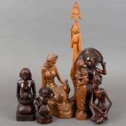 Zeven gesneden houten beeldjes: zes Balinese schones, en zittende man, alle Bali, grootste beeld 49 cm
