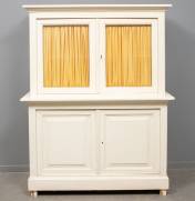 Crèmewitgelakte vierdeurs kast, de bovenste deurtjes met geplisseerde gele stof achter het glas, 20e eeuw -lichte gebruikssporen, bij bovenste deurtjes ontbreekt slot-, 174 × 137 × 50 cm