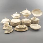 Porseleinen serviesgedeelte met bewerkte bies en goudkleurige rand, ontwerp Paul Müller, uitvoering Hutschenreuther, bestaande uit: drie bedekte terrines, twee saucières, ovale dienschaal met oren, één grote en drie kleine ovale dienschalen, ronde schaal, botervloot, zes eierdoppen, achttien ontbijtborden, twaalf dinerborden, en twaalf diepe borden -gebruikssporen, enkele kleine beschadigingen-