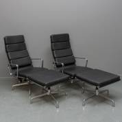 Paar draaibare armstoelen met zwarte skai bekleding, metalen frame en poot, en bijpassende voetenbankjes, in de stijl van Charles & Ray Eames, uitvoering onbekend