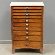 Eiken ladekastje met tien lades en een natuurstenen bovenblad, 20e eeuw -gebruikssporen-, 91 × 60 × 30 cm