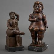Twee bronzen beeldjes: dikke dames, beide niet gesigneerd, naar Fernando Botero, 20e eeuw, 33,5 en 26,5 cm inclusief natuurstenen basementjes