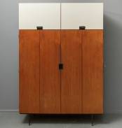 Deels witte teakhouten linnenkast, met twee klapdeurtjes en twee vouwdeuren, Japanse serie, ontwerp Cees Braakman, uitvoering Pastoe, jaren '60 -extra handvatten aan bovenste deuren geplaatst, kapstok aan de zijkant gemaakt -, 201 × 157 × 55 cm