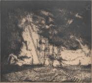 Hollandse School: dreigende lucht boven hoogspanningskabels, ets 10/15, r.o. onduidelijk gesigneerd en l.o. gedateerd '74, 22 × 25 cm