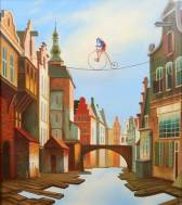 Schilderij: harlekijn fietst over koord, olieverf op doek, r.o. gemonogrammeerd Z.B, en gedateerd '99, 101 × 90 cm