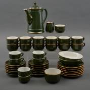 Groen porseleinen serviesgedeelte met gouden rand, model Apilco Flora Vert, uitvoering Deshoulières, Limoges, Frankrijk, bestaande uit: koffiepot, twaalf koffiekop-en-schotels, zes taartbordjes, twee suikerpotten, melkkan, daarbij zes groene porseleinen mokkakopjes en twee roomschaaltjes, hoogte koffiepot 23 cm