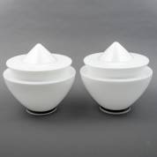 Paar opaline lampenkappen, Gispen-stijl, tweede kwart 20e eeuw, -zonder armaturen, ingeblazen deukjes, randschilfertjes, één kap met chipje van de punt-, 36 × 32 cm