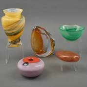 Drie glazen vazen, één kom, en één object, diverse uitvoeringen, alle tweede helft 20e eeuw, hoogte grootste vaas 20 cm