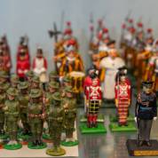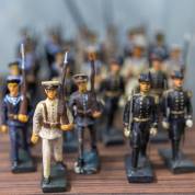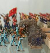 Diverse beschilderde tinnen soldaatjes, waaronder: Zwitserse garde, Pruisische grenadiers, en de generaals Lee en Grant
