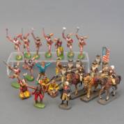 Verzameling composiet figuurtjes: Indianen, cowboys en figuren uit de Amerikaanse Onafhankelijkheidsoorlog, Elastolin, jaren '50/'60 -mogelijk overgeschilderd/ gemodificeerd-