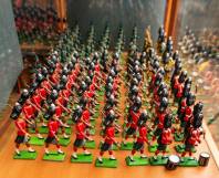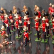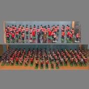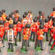 Verzameling tinnen soldaatjes, deels musicerend, diverse Engelse en Schotse eenheden, Chelsea pensioners, Koningin Elizabeth II, uitvoering W. Britain, eind 20e eeuw -geen dozen-