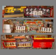 Divers stoomspeelgoed: stoommachine, worstenmaker, waterput, smit, twee slijpstenen, vier aandrijfriemblokken, alle uitvoering Fleischmann, tweede helft 20e eeuw