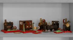 Divers stoomspeelgoed: drie stoommachines, stoomlocomotief met goederenwagon, mechanische hamer, polijstschijf, en aandrijfriemblok, alle uitvoering Mamo, tweede helft 20e eeuw